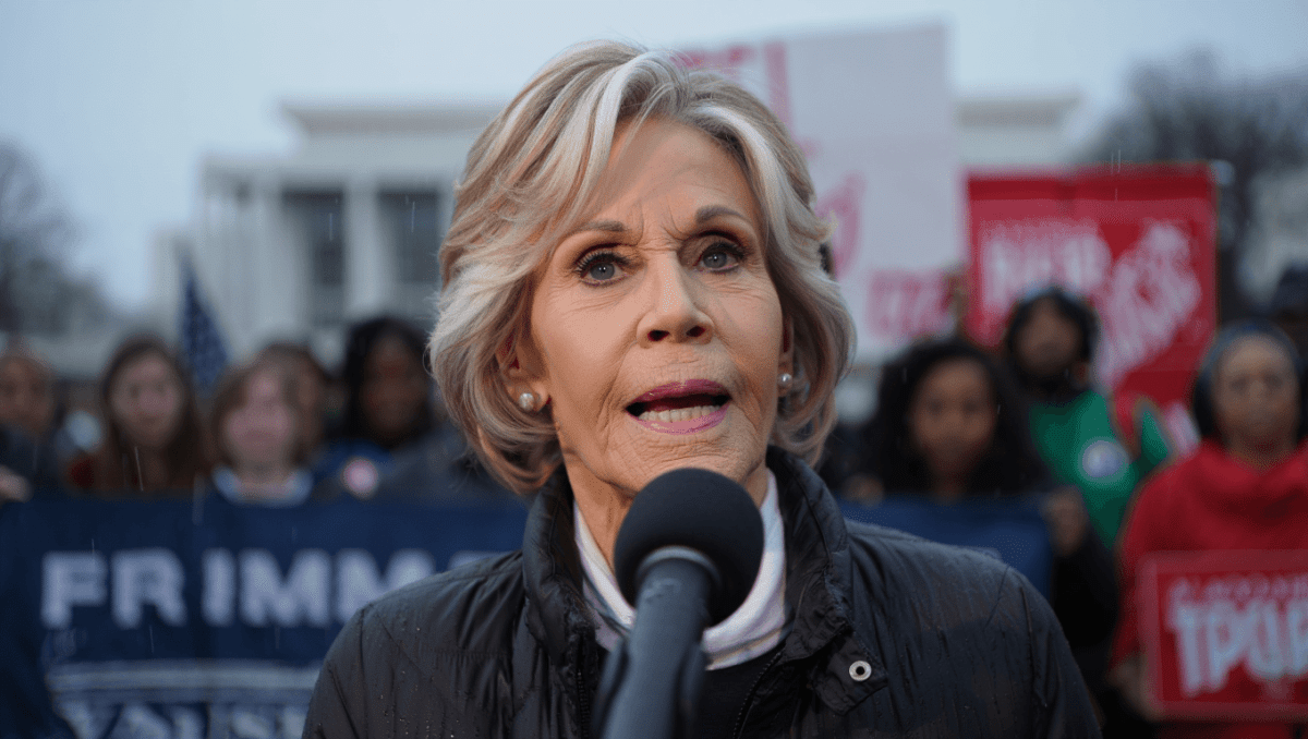 Jane Fonda took the stage under a gray, rainy sky to deliver a stirring message to Americans. She urged citizens to “break your silence and stand tall against authoritarianism.” The two-time Oscar winner detailed the administration’s assault on cultural institutions. “Today, books are being banned, plaques and monuments depicting historical events this administration wants to forget are being removed,” she said.